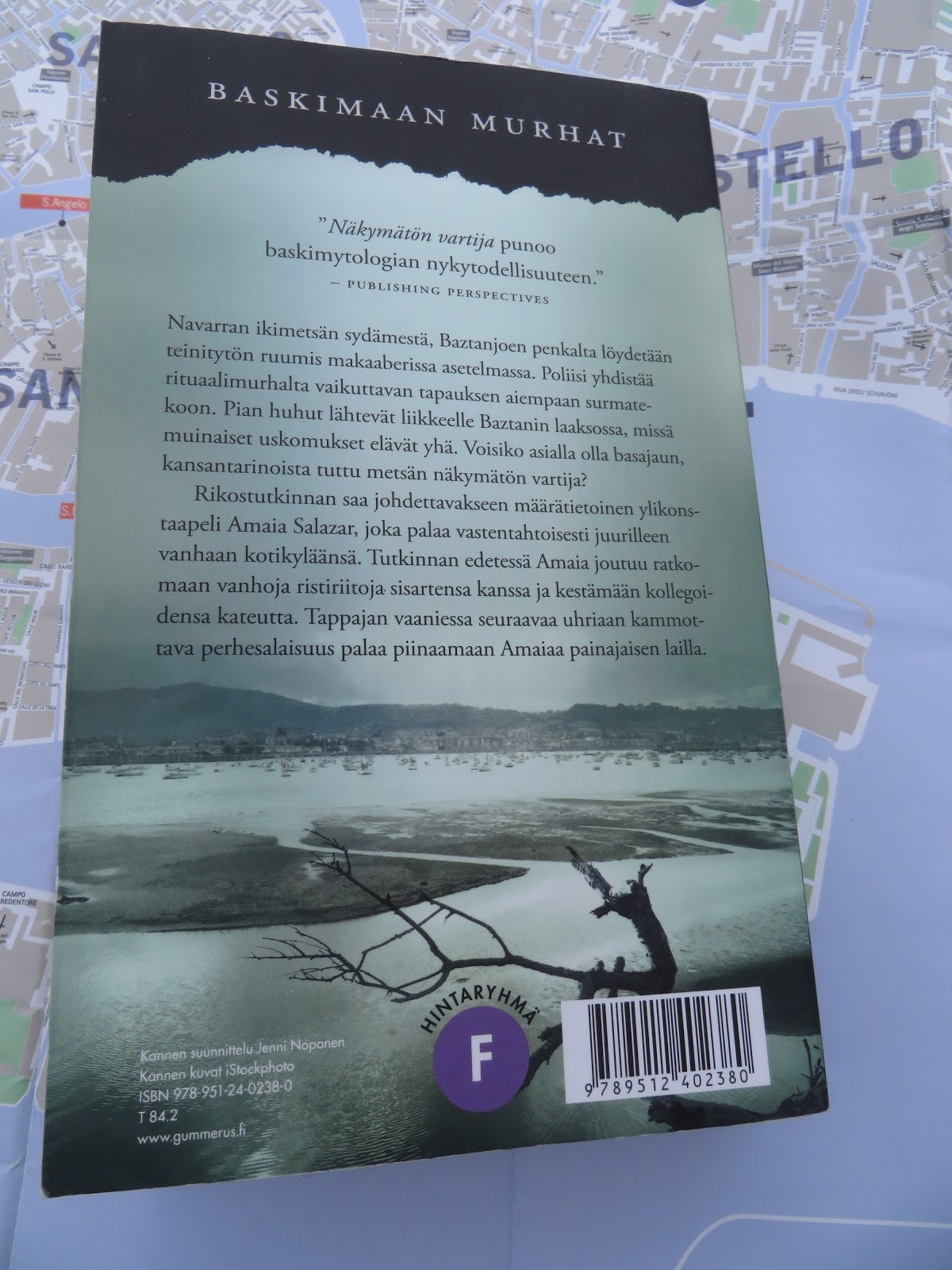 Luin kirjan Venetsian matkalla, sen vuoksi rekvisiittana on Venetsian kartta.